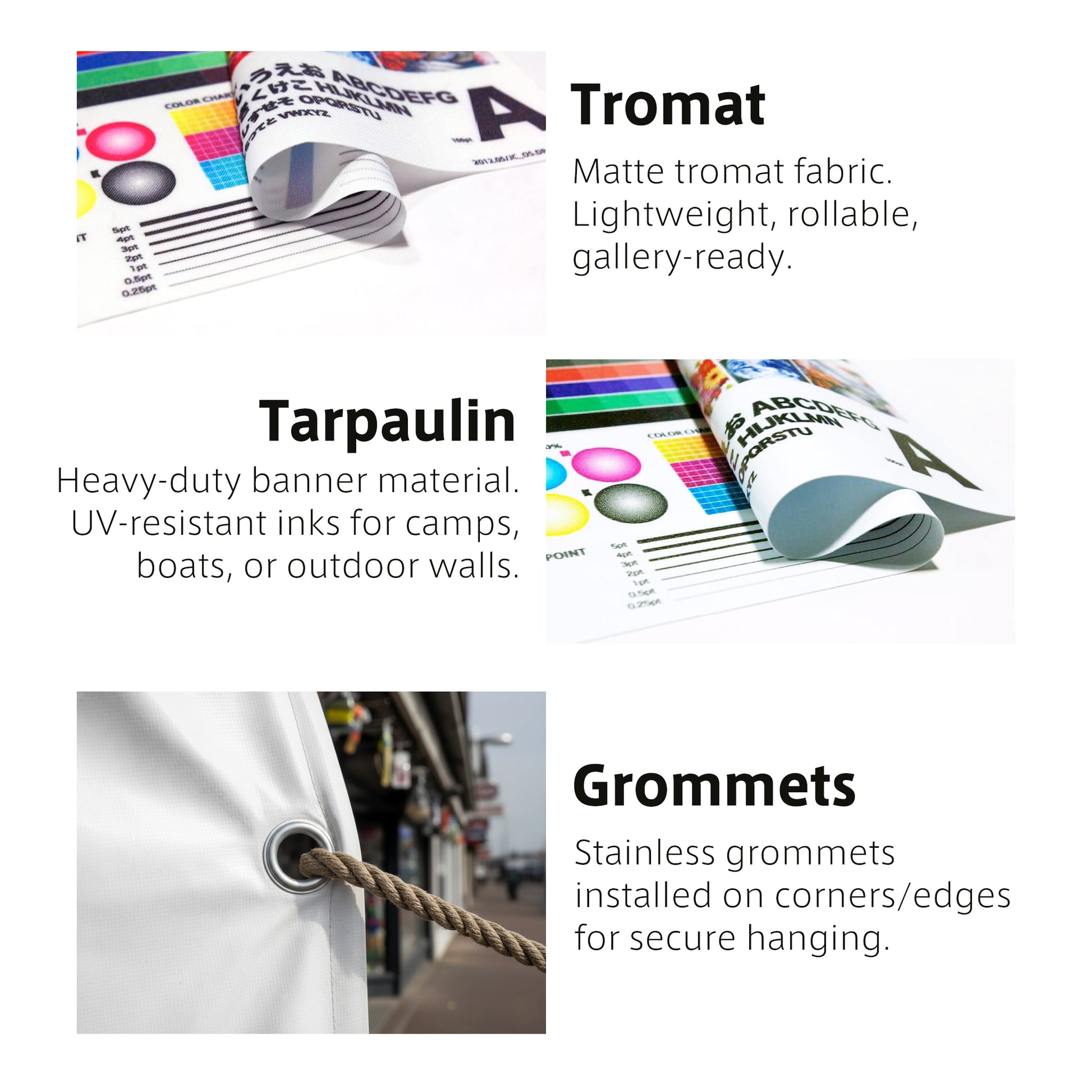 - Outdoor (Banner – Tarpaulin): heavy-duty with UV-resistant inks, ideal for boats, camps, or outdoor walls.